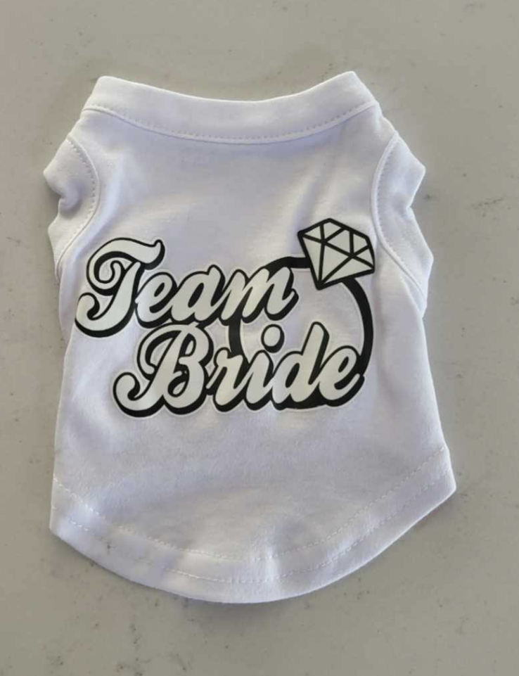 Get your furry friend ready for the big day with this adorable white dog shirt! Designed with the word "Team Bride" on it, this shirt is perfect for pets who want to show their support for the bride-to-be. Made from high-quality materials, this shirt is comfortable and durable, ensuring that your pet can wear it for any pre-wedding festivities. Whether it's a bridal shower, bachelorette party, or engagement photoshoot, this shirt will make your pet the center of attention. Get your pet in on the wedding fun with this stylish and cute dog shirt!