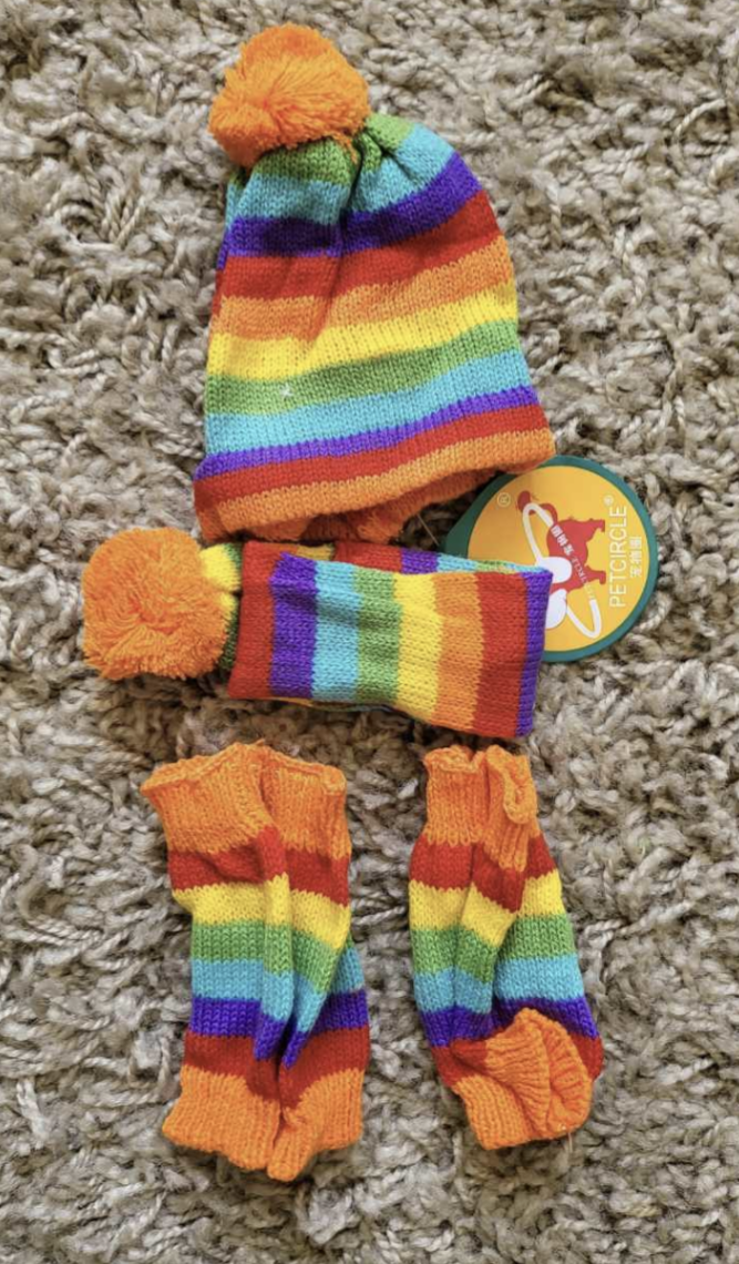 The cute design adds a touch of fun to your petβs outfit, making them even more irresistible. Get this set of hat, scarf, and leg warmers for your precious pet today!