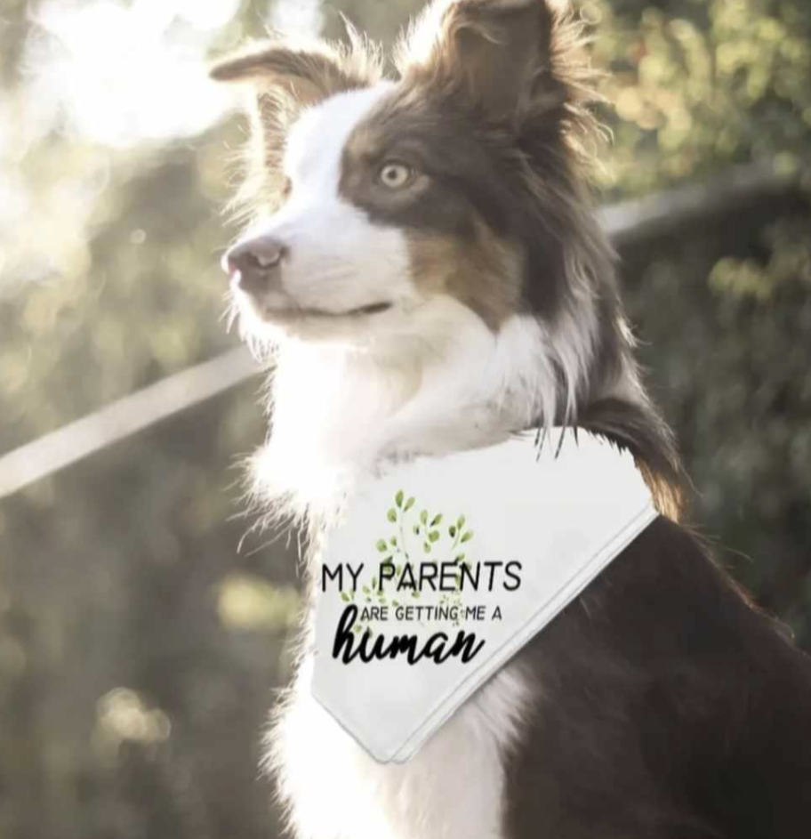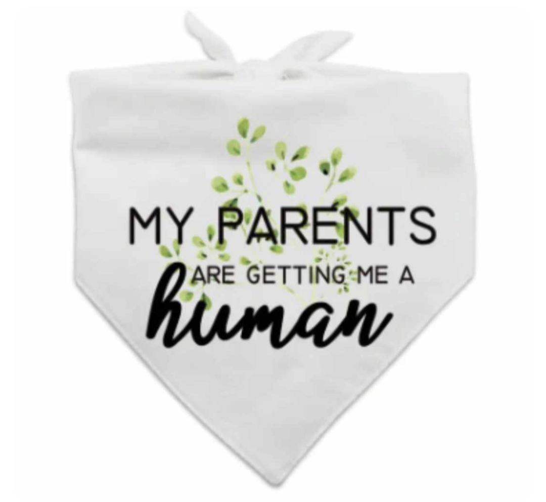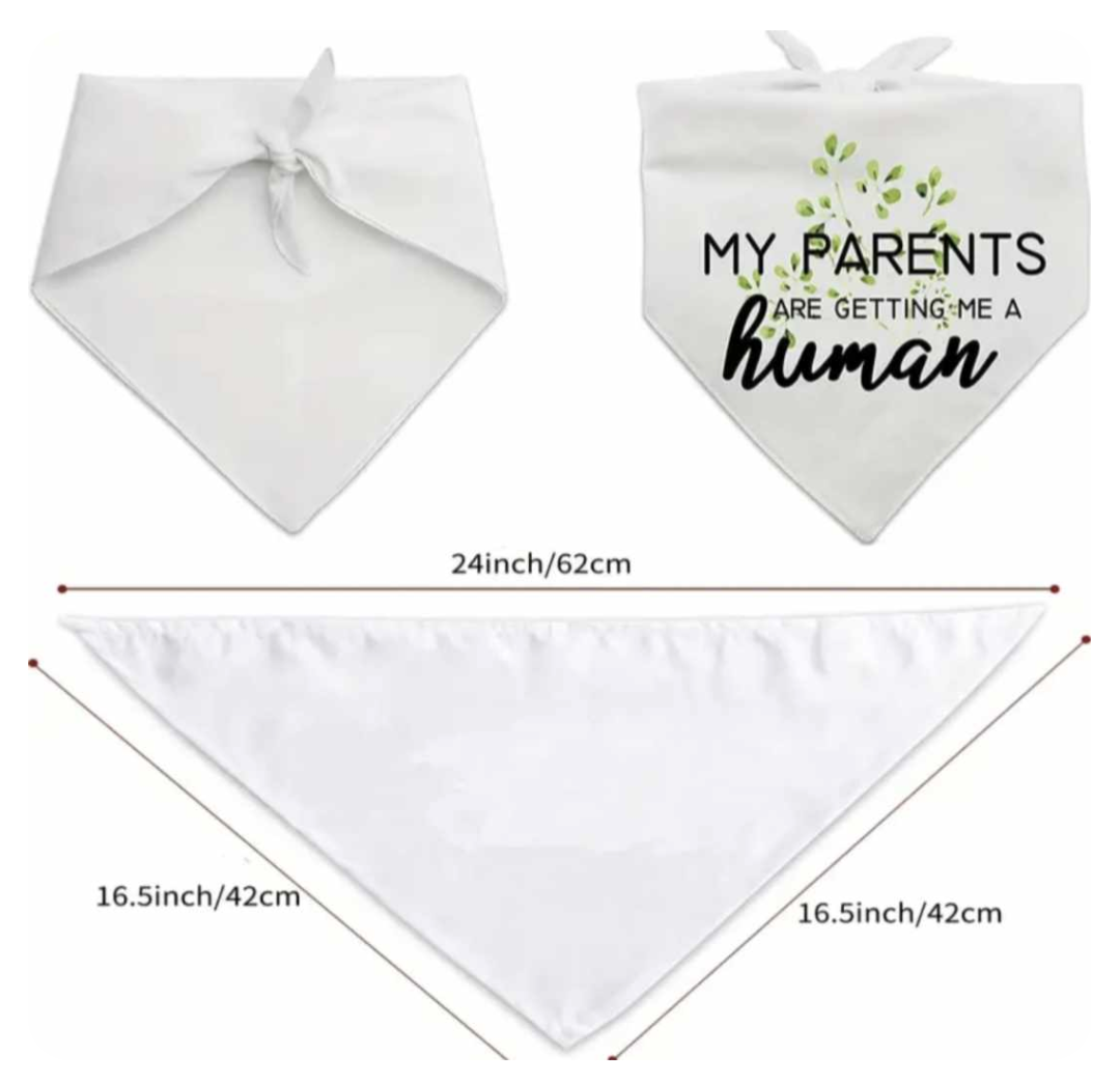 Whether you're planning a proposal or announcing your engagement, this bandana will add an extra touch of cuteness to the occasion. Let your dog help you pop the question and create memories that will last a lifetime. ππ this bandana features a playful message that says, "My parents are getting me a human." Made with love and care, this bandana is perfect for pets who are eagerly awaiting the arrival of a new sibling.Β